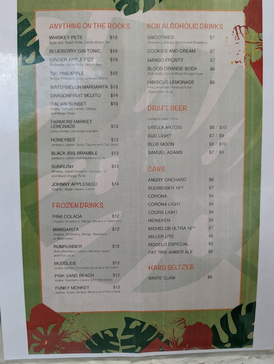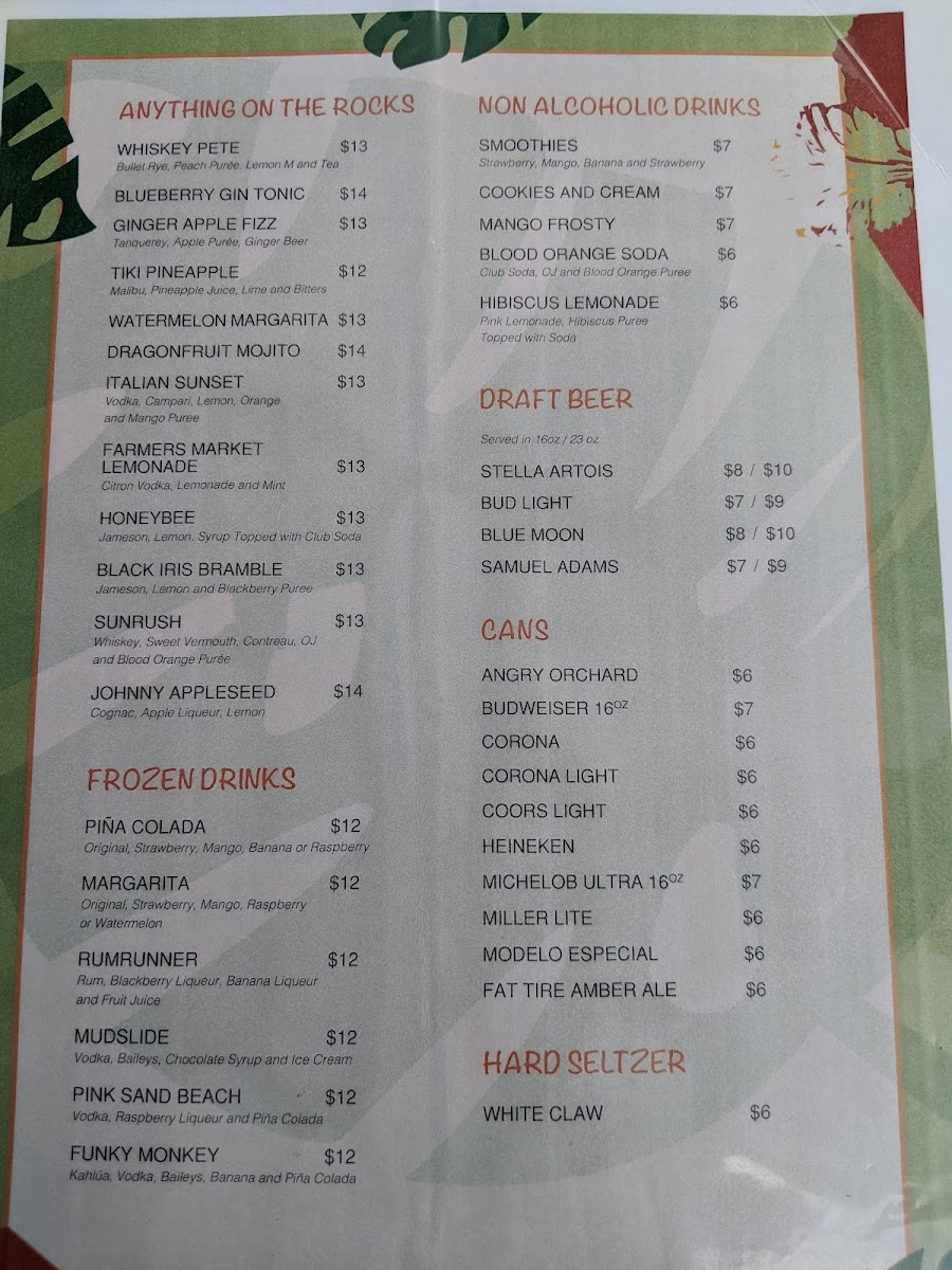 The drink selection complements the menu well, featuring refreshing cocktails like margaritas and daiquiris, alongside a curated list of crisp white wines and hard seltzers. These pair naturally with the casual, open atmosphere—whether dining indoors or enjoying the outdoor breeze near South Roosevelt Boulevard.